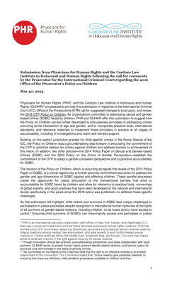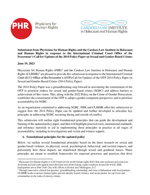 This report was submitted by the Cardozo Law Institute in Holocaust and Human Rights (CLIHHR) and Physicians for Human Rights (PHR) in May 2023 to the Office of the Prosecutor (OTP) of the International Criminal Court (ICC). It provides legal and strategic recommendations on investigating and prosecuting crimes of sexual and gender-based violence, with an emphasis on survivor-centered approaches and international legal standards. The submission highlights the importance of addressing such crimes within the framework of international justice.