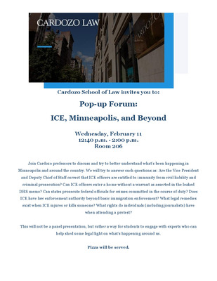 Join Cardozo professors to discuss and try to better understand what’s been happening in Minneapolis and around the country. We will try to answer such questions as: Are the Vice President and Deputy Chief of Staff correct that ICE officers are entitled to immunity from civil liability and criminal prosecution? Can ICE officers enter a home without a warrant as asserted in the leaked DHS memo? Can states prosecute federal officials for crimes committed in the course of duty? Does ICE have law enforcement authority beyond basic immigration enforcement? What legal remedies exist when ICE injures or kills someone? What rights do individuals (including journalists) have when attending a protest?