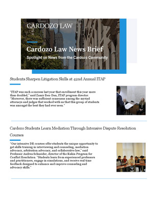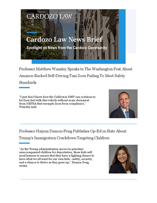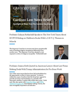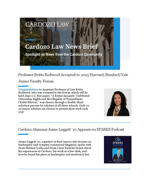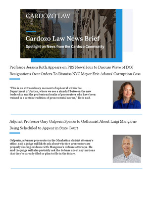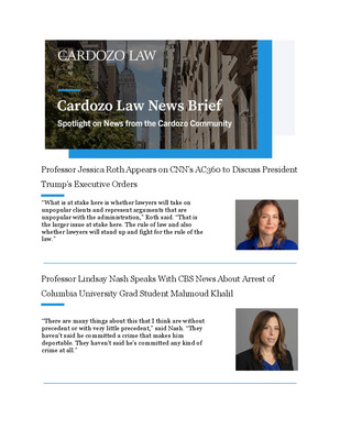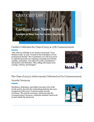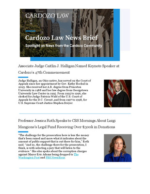 This collection features Cardozo Law News Briefs published in 2025, highlighting faculty media appearances, institutional announcements, student achievements, and scholarly contributions. These briefs showcase Cardozo’s active role in legal scholarship and public dialogue throughout the year.
