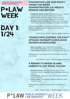 This document outlines the full schedule for P*LAW Week 2022 at Cardozo School of Law, presented by the Center for Public Service Law. Held virtually from January 24 to January 27, the week featured panels, workshops, and discussions on key issues in public interest law, including immigration policy, educational equity, criminal justice reform, reproductive rights, data privacy, military law, labor rights, and overdose prevention. Events brought together legal professionals, advocates, scholars, and Cardozo students to explore law’s role in advancing social justice and supporting vulnerable communities.