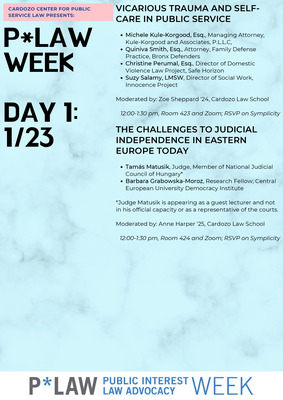 Public Law (P*Law) Advocacy Week is a weeklong, student-led series of events at the Benjamin N. Cardozo School of Law dedicated to exploring and advancing public interest law. Hosted annually, P*Law features panels, workshops, and discussions with legal practitioners, scholars, and community advocates who are committed to justice and social change.