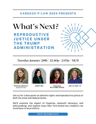 Hosted by Cardozo P*LAW 2025, this January 28 event explored abortion rights and reproductive justice under the Trump administration. Panelists discussed litigation, nonprofit advocacy, and policymaking at both state and federal levels, with a focus on how New York-based law students can support local efforts. Moderated by Bella Pori ’21.