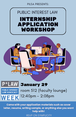 A Public Interest Law workshop hosted by PILSA on January 29, offering students help with internship application materials like cover letters, résumés, and writing samples.