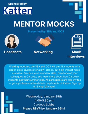 Mentor Mocks, presented by SBA and OCS and sponsored by Katten, offered 1L students the chance to practice interview skills through mock interviews with upper-class students.